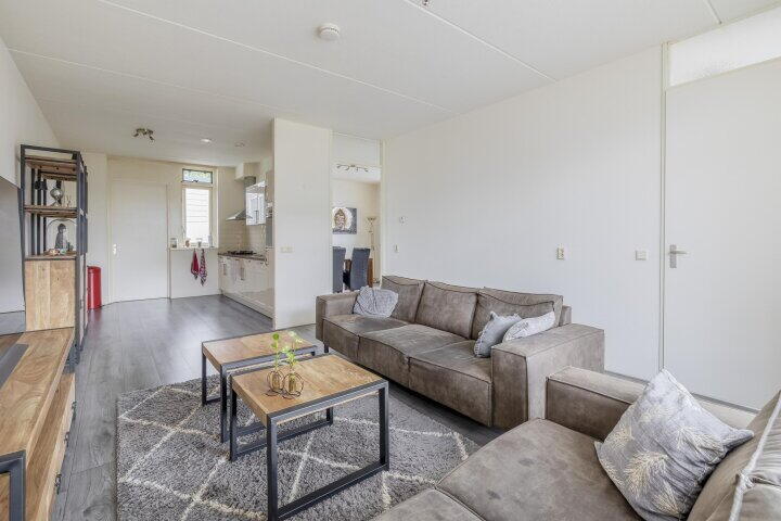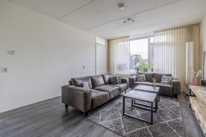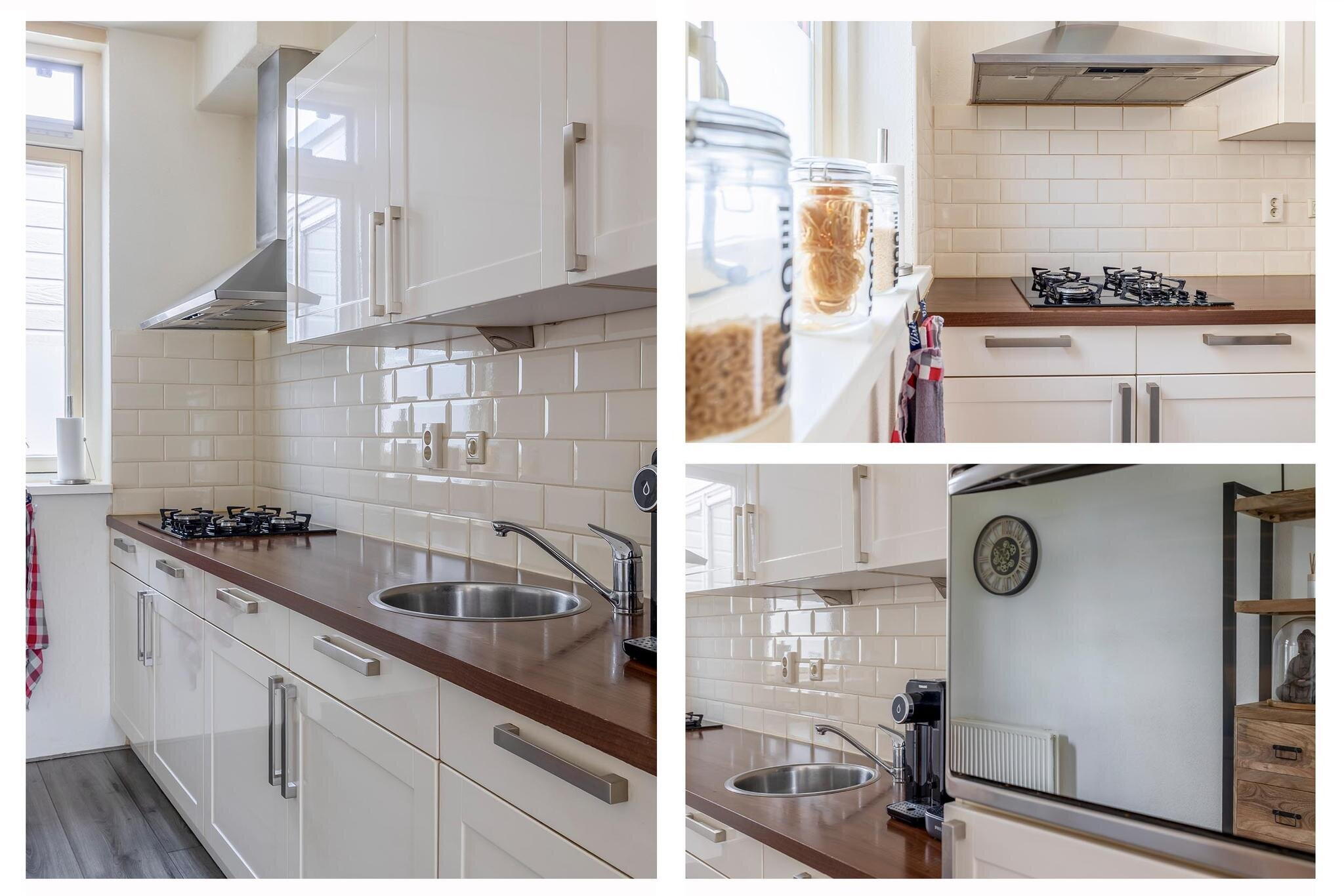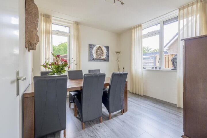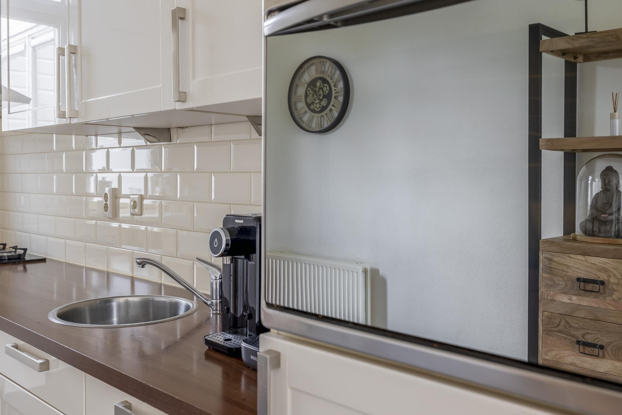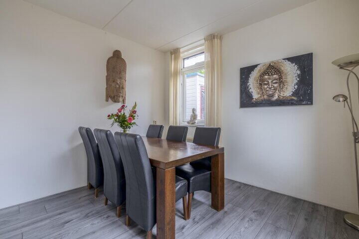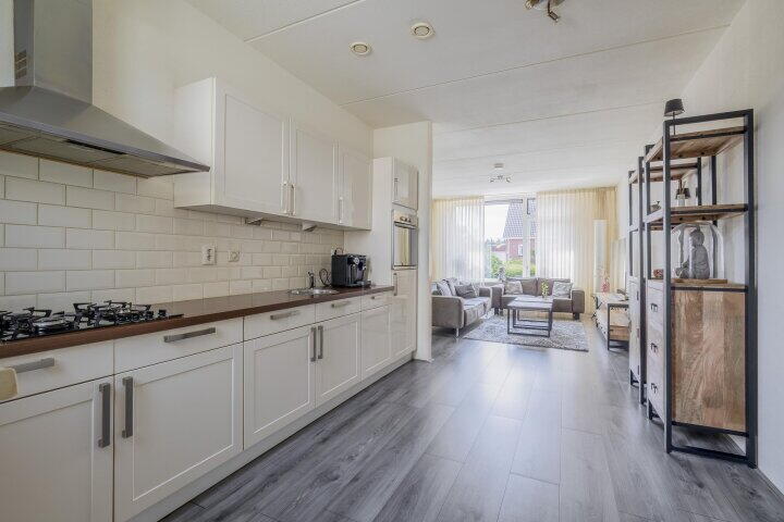 Je komt binnen in de hal met meterkast, trap naar de verdieping en toegang tot de badkamer. De geheel betegelde badkamer is voorzien van een hangtoilet, modern badkamermeubel, designradiator en halfopen douchehoek. De sfeervolle woonkamer is lekker licht door het grote raam, met buitenzonwering, aan de voorkant. De af te sluiten eetkamer aan de achterkant is gemakkelijk in gebruik te nemen als slaapkamer. Kies je voor dit laatste, dan is er in de woonkamer met open keuken voldoende ruimte voor een eettafel met stoelen of (eet)bar met krukken. De open keuken heeft een keukenblok in landelijke stijl welke is voorzien van diverse inbouwapparatuur zoals een 4 pits gasfornuis met afzuiging, vaatwasser, oven en koelkast. Door het keukenraam heb je fijn daglicht in de keuken.