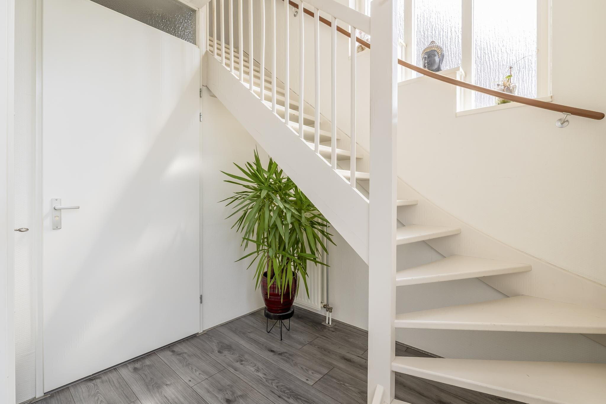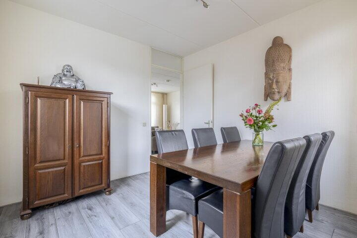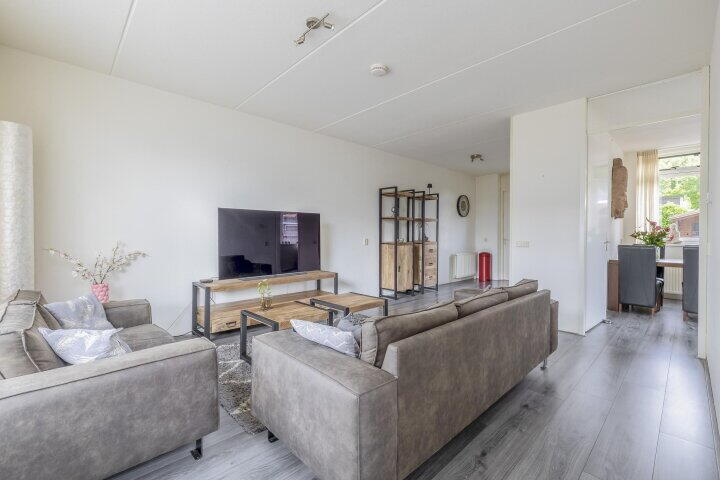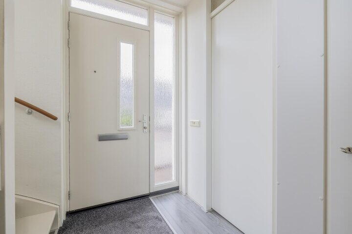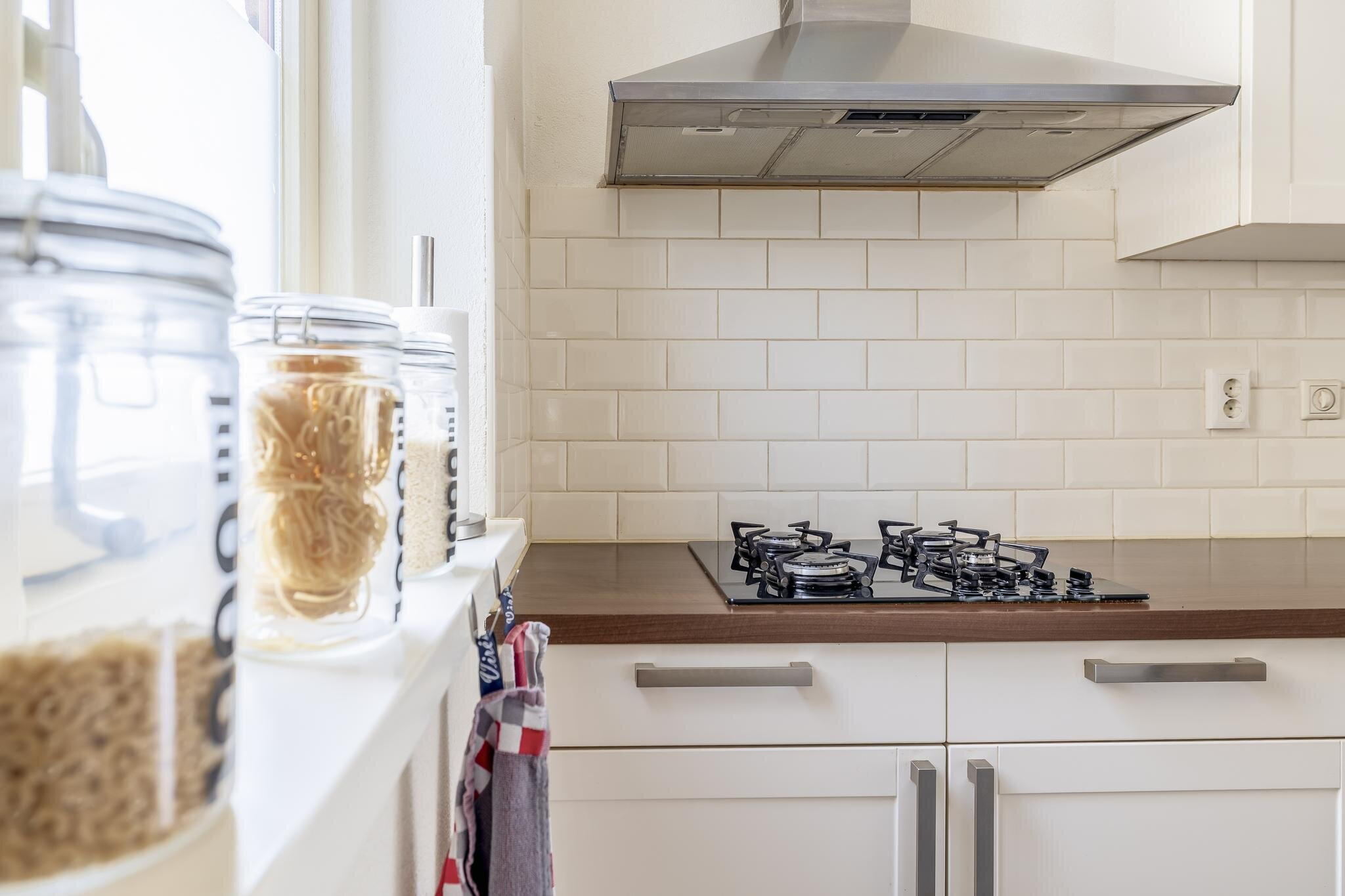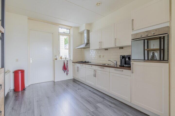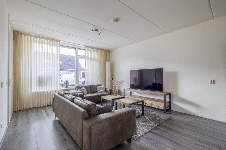 Je komt binnen in de hal met meterkast, trap naar de verdieping en toegang tot de badkamer. De geheel betegelde badkamer is voorzien van een hangtoilet, modern badkamermeubel, designradiator en halfopen douchehoek. De sfeervolle woonkamer is lekker licht door het grote raam, met buitenzonwering, aan de voorkant. De af te sluiten eetkamer aan de achterkant is gemakkelijk in gebruik te nemen als slaapkamer. Kies je voor dit laatste, dan is er in de woonkamer met open keuken voldoende ruimte voor een eettafel met stoelen of (eet)bar met krukken. De open keuken heeft een keukenblok in landelijke stijl welke is voorzien van diverse inbouwapparatuur zoals een 4 pits gasfornuis met afzuiging, vaatwasser, oven en koelkast. Door het keukenraam heb je fijn daglicht in de keuken.