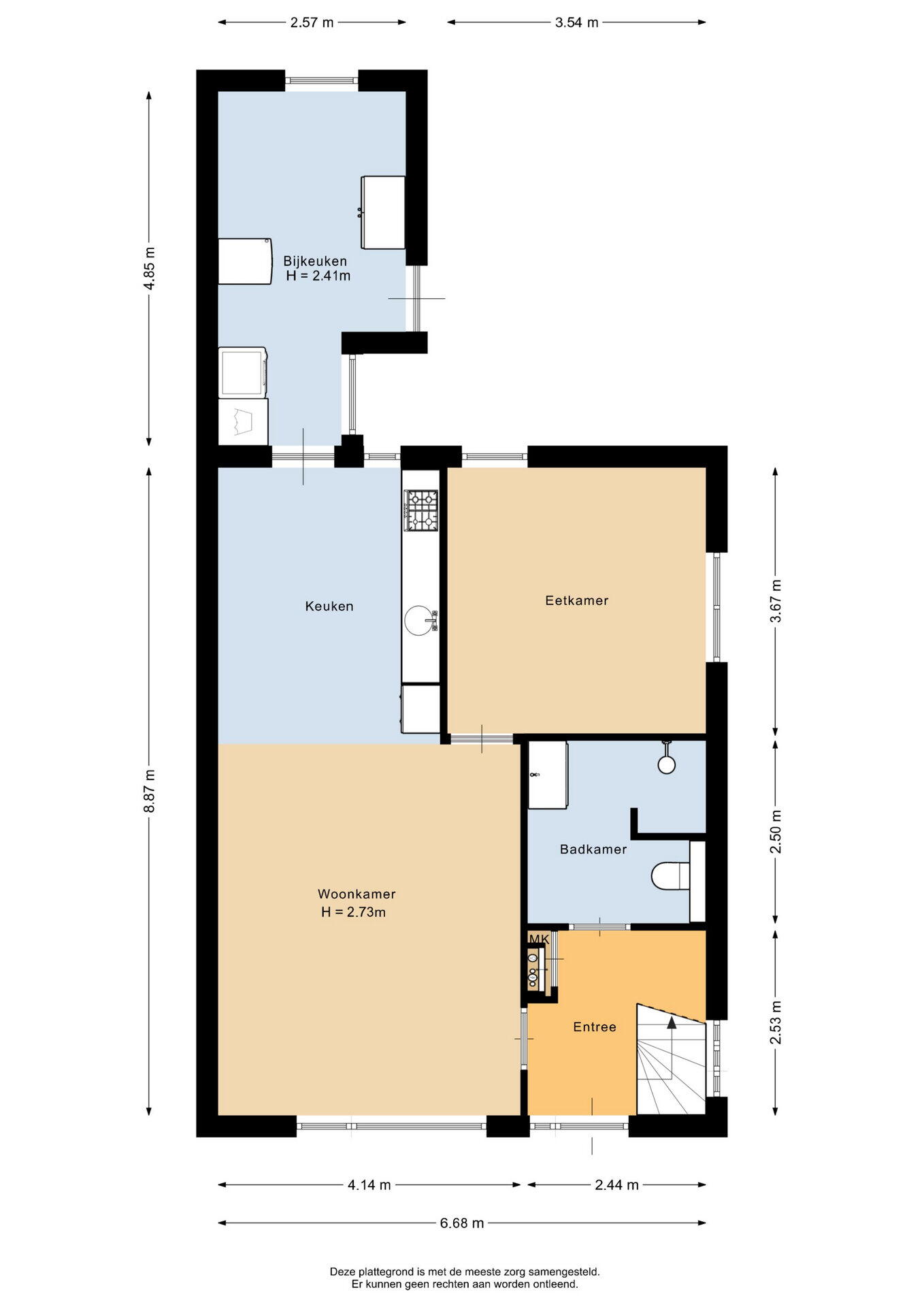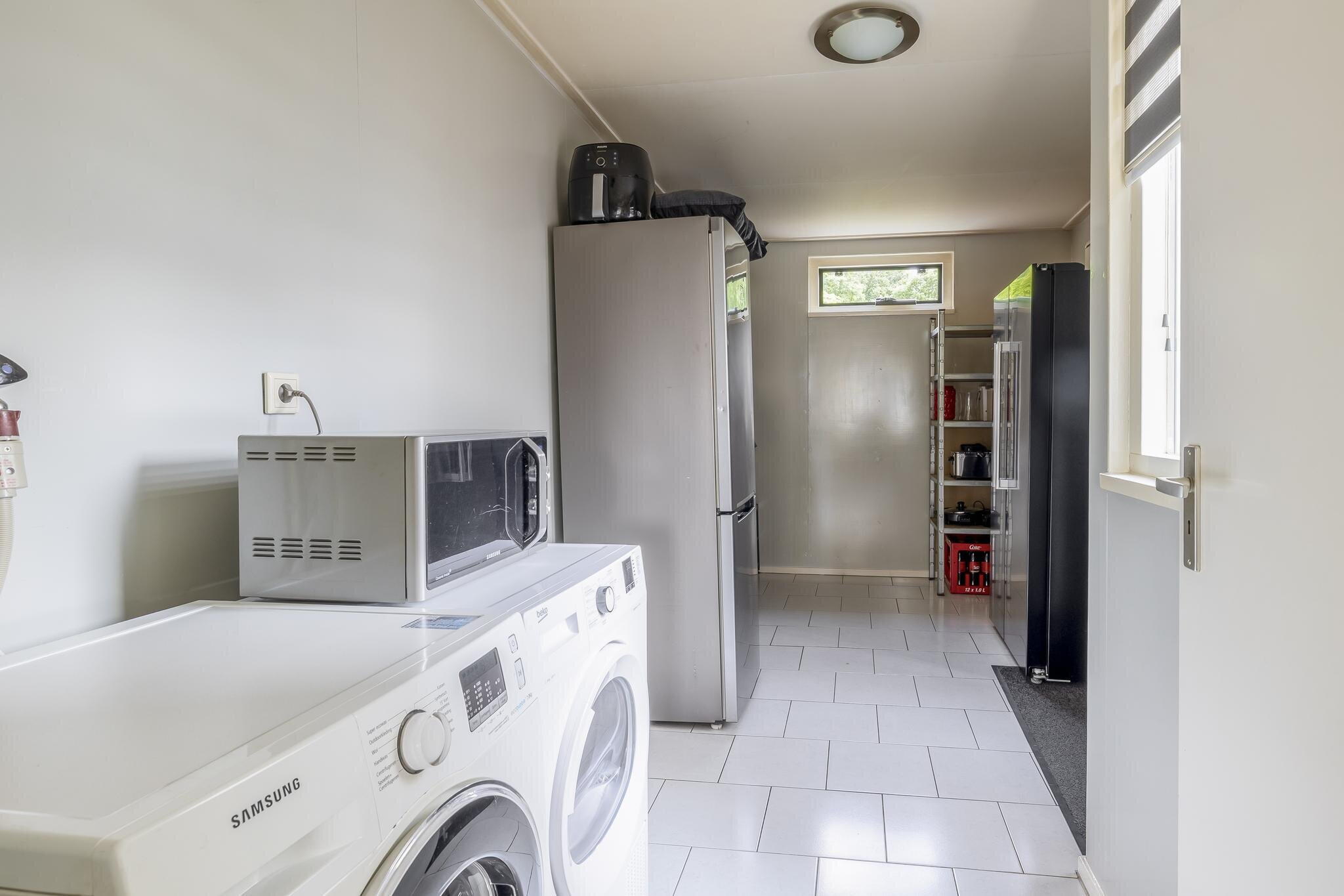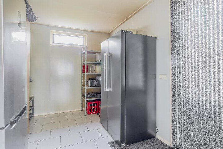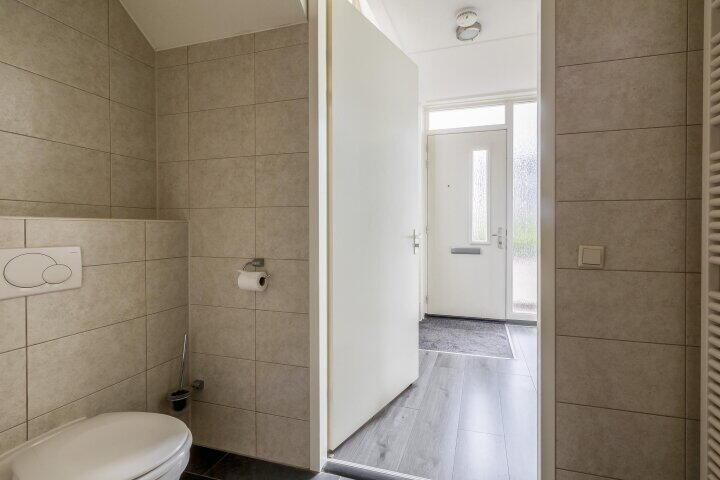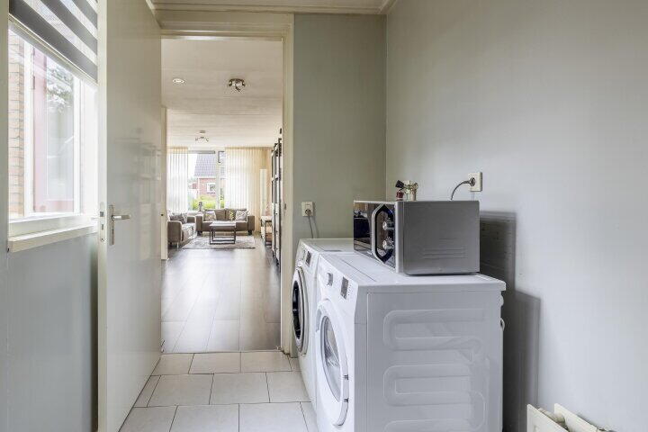 De bijkeuken is ruim, heeft 2 ramen en een deur naar het terras achter de woning. Hier vind je ook de aansluiting voor witgoed. Op de gehele begane grond ligt een laminaatvloer met uitzondering van de bijkeuken en badkamer.