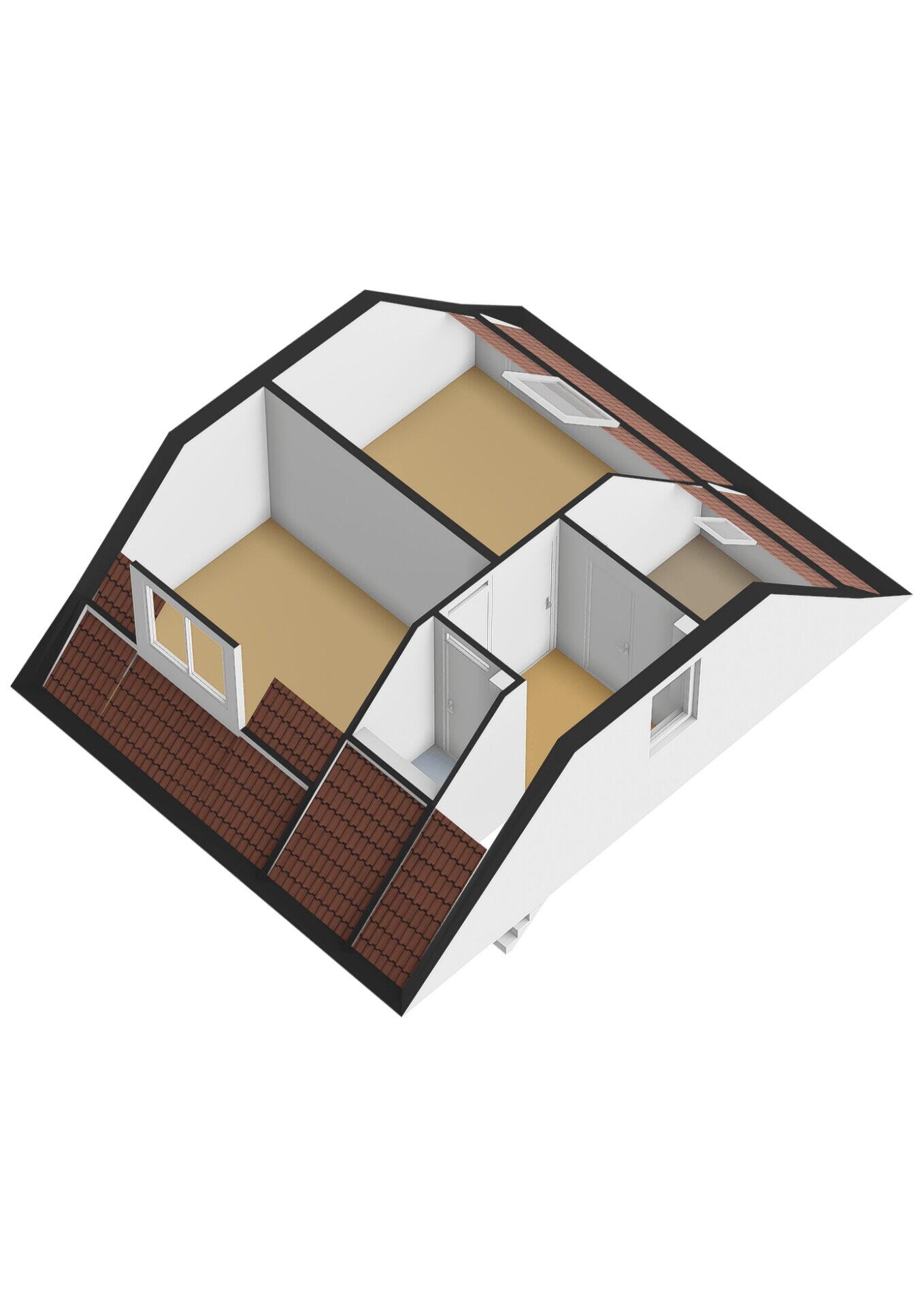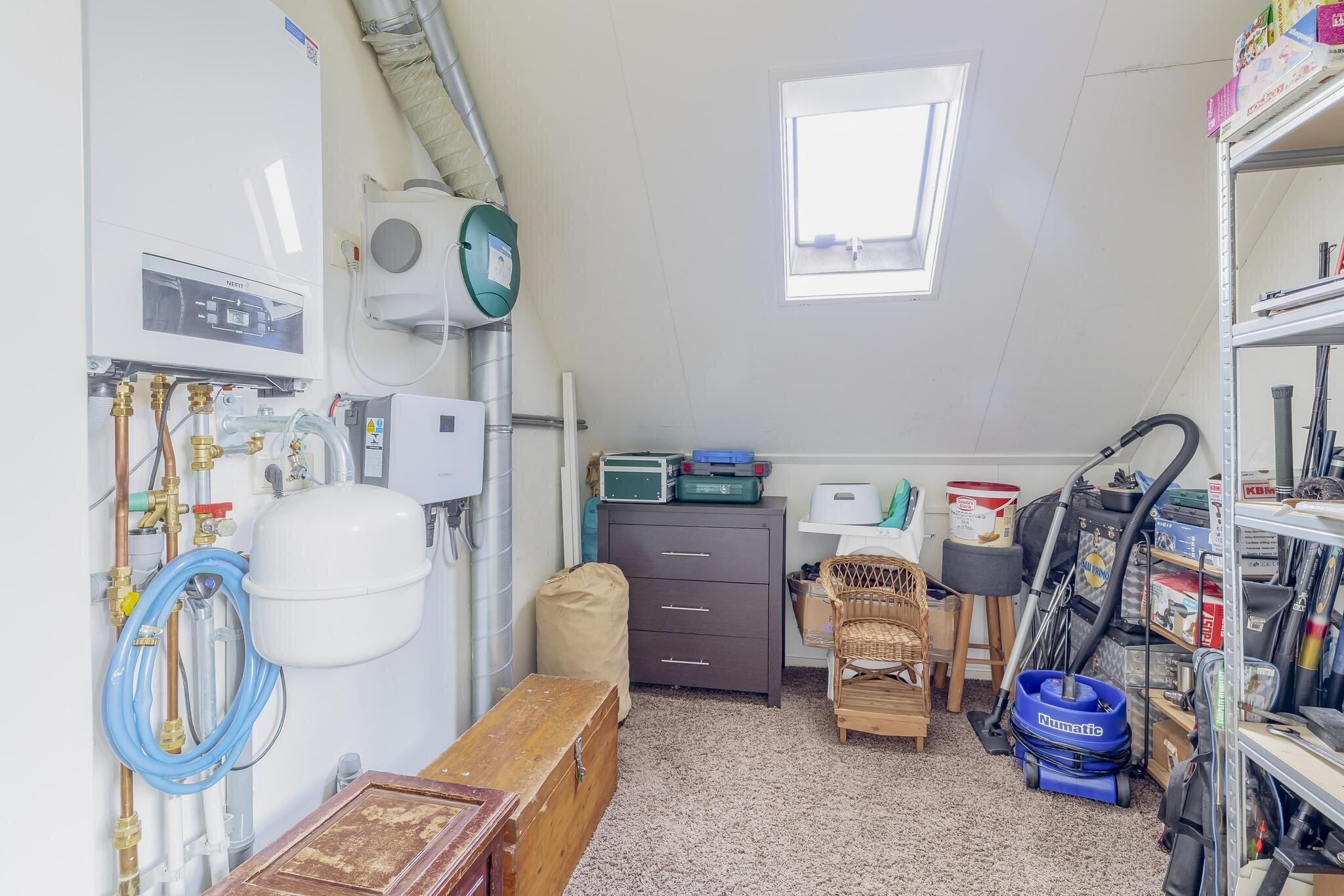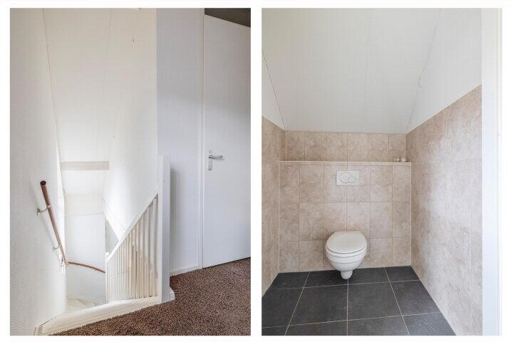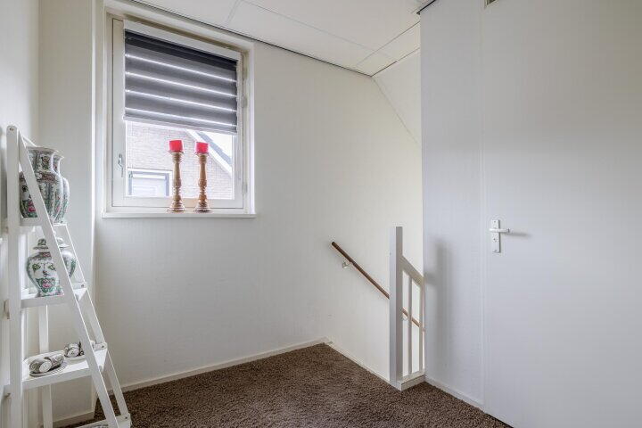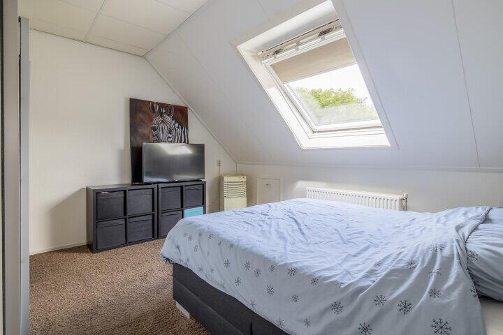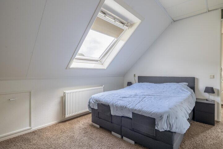 Via een houten trap kom je op de overloop met raam, apart toilet en 2 ruime slaapkamers waarvan 1 met een dakkapel (voorzijde) en de ander, aan de achterzijde, met een groot Velux dakraam. Achter de netjes afgewerkte schuine wanden is extra bergruimte handig via een een luik bereikbaar. Verder vind je hier nog een berging met de CV opstelling, mechanische ventilatie, zonnepanelen-omvormer. Extra kamer nodig? Op deze verdieping ligt vloerbedekking.