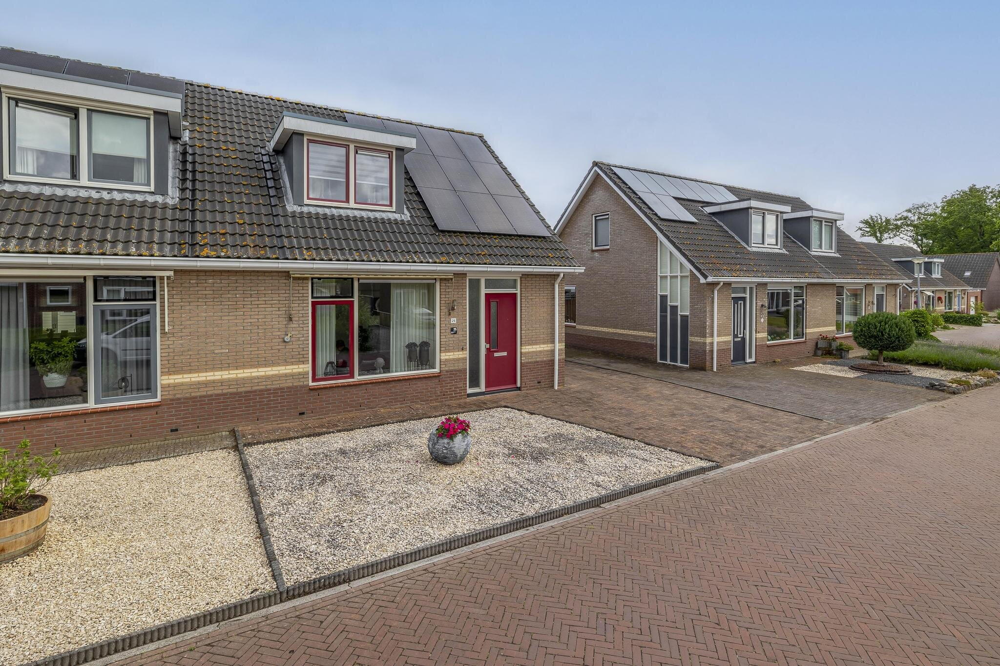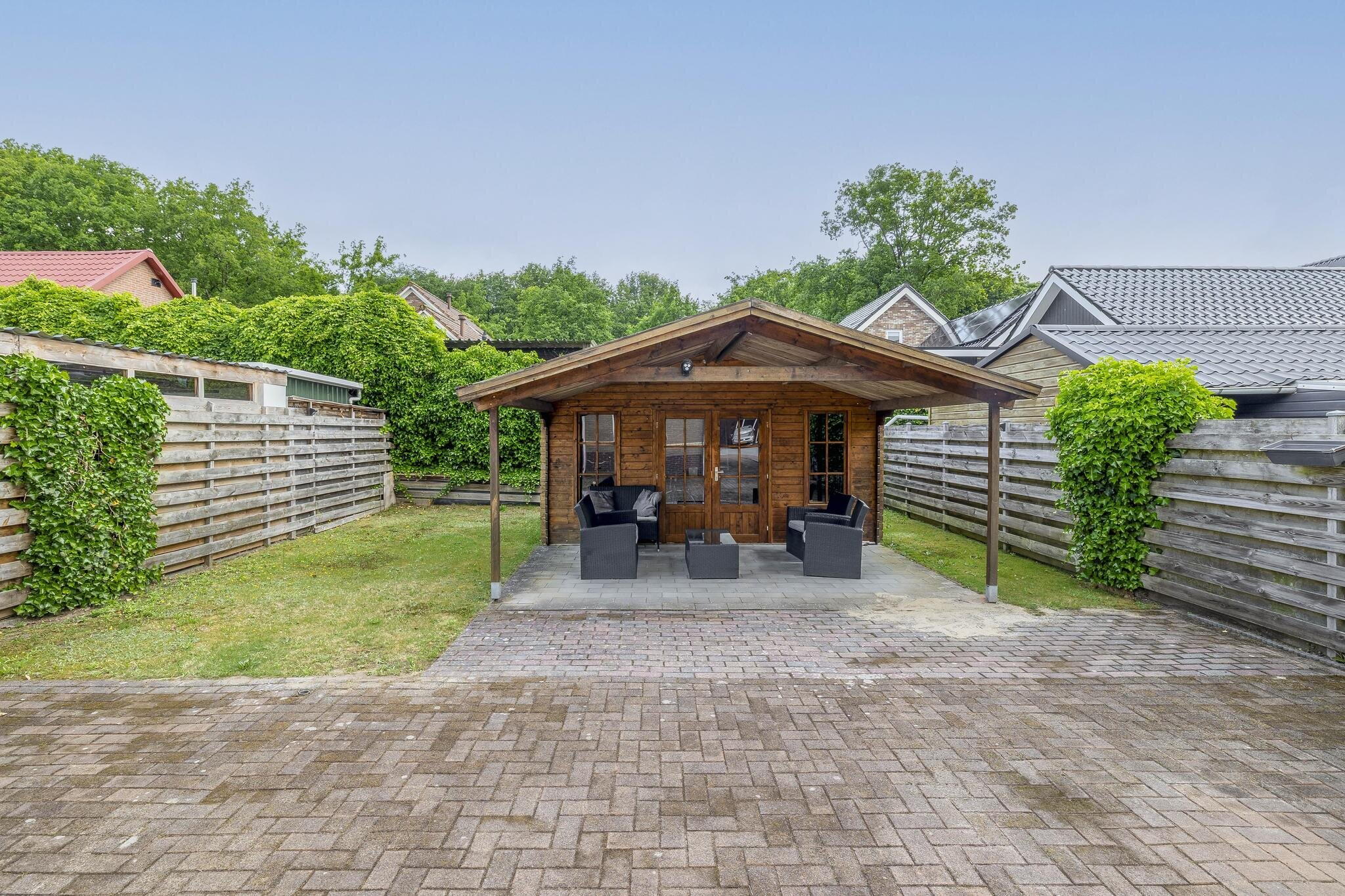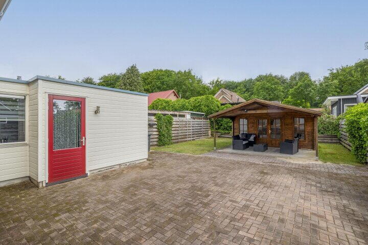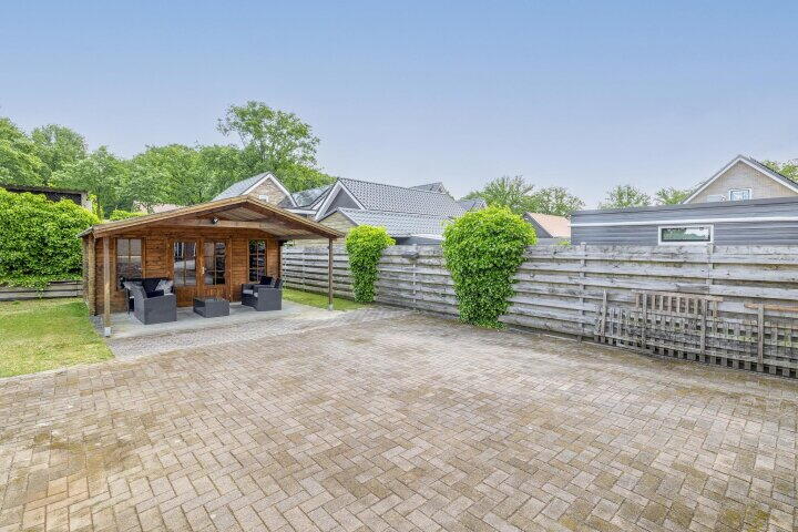 De voortuin bestaat uit een grindvlak en nette bestrating welke doorloopt naast de woning als oprit en achter de woning overgaat in een royaal terras. De op het noorden gelegen achtertuin (geen overbodige luxe in de hete zomer) is onderhoudsvriendelijk aangelegd. De schuttingen rondom bieden de nodige privacy. Tussen de grasstroken achterin staat een mooi groot houten tuinhuis in Zwitserse stijl met schuurgedeelte (ca 14 m²) en een net zo ruime overkapping aan de voorzijde. Hier kun je gezellig, droog en in de schaduw zitten.