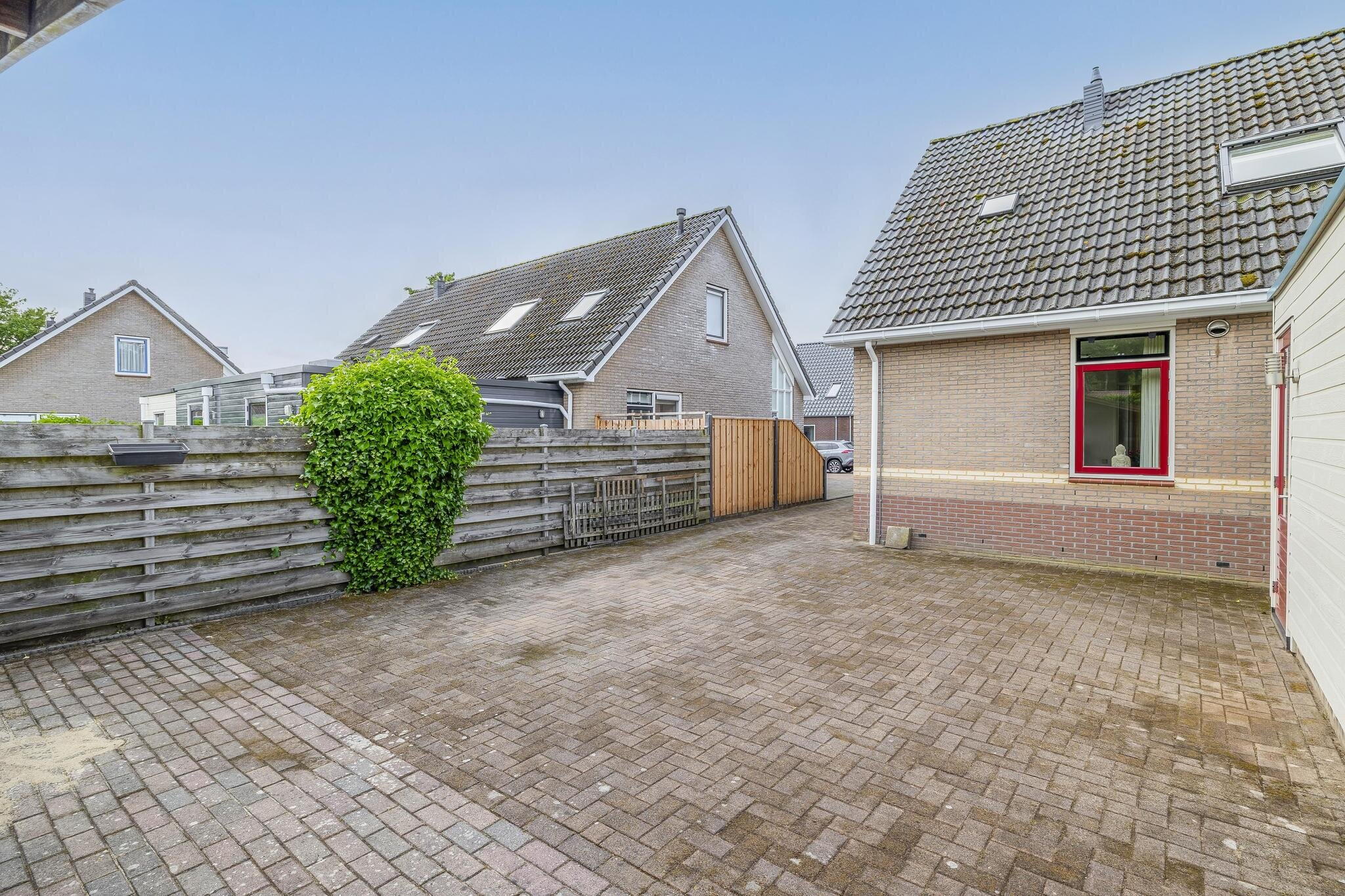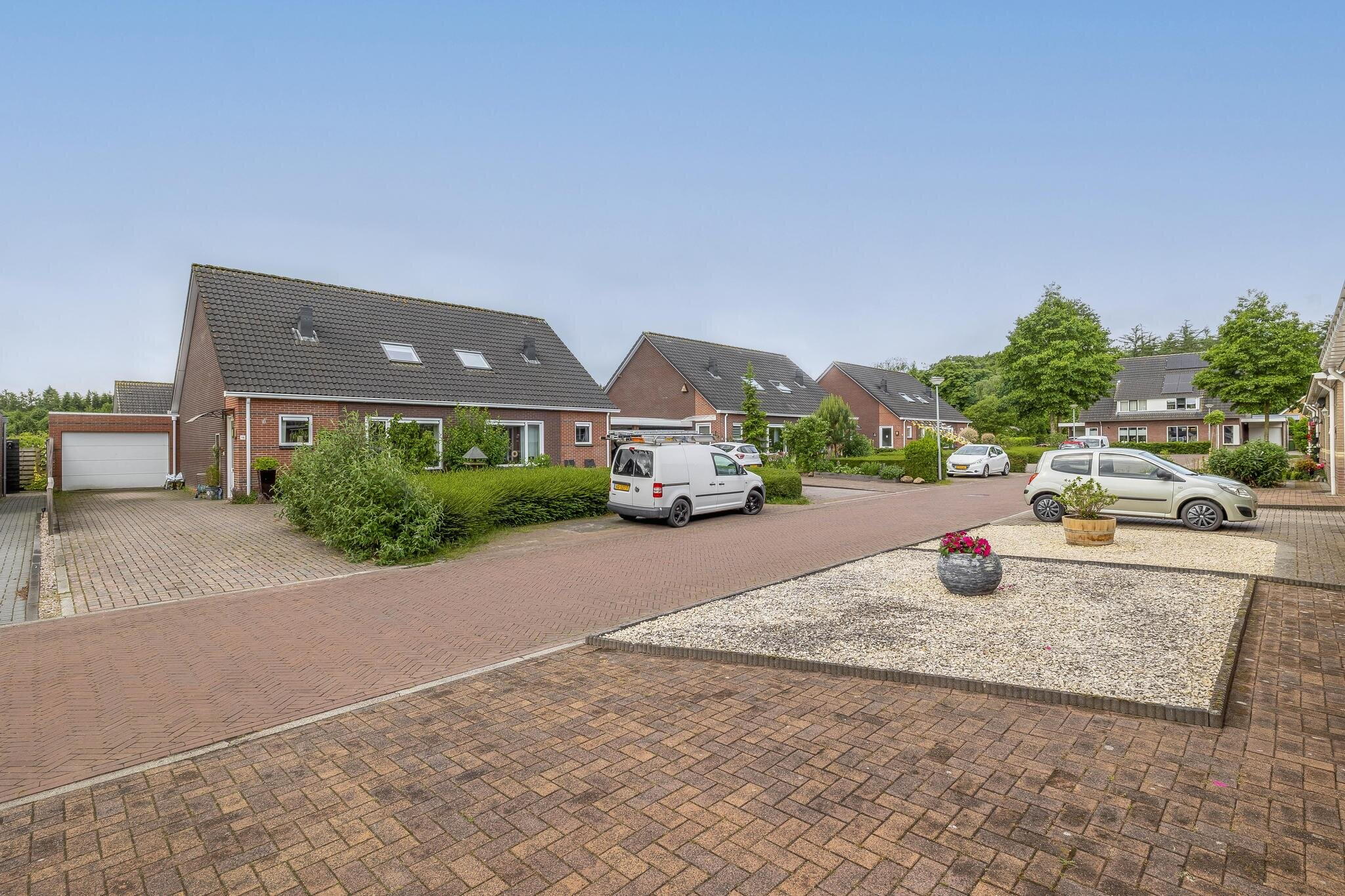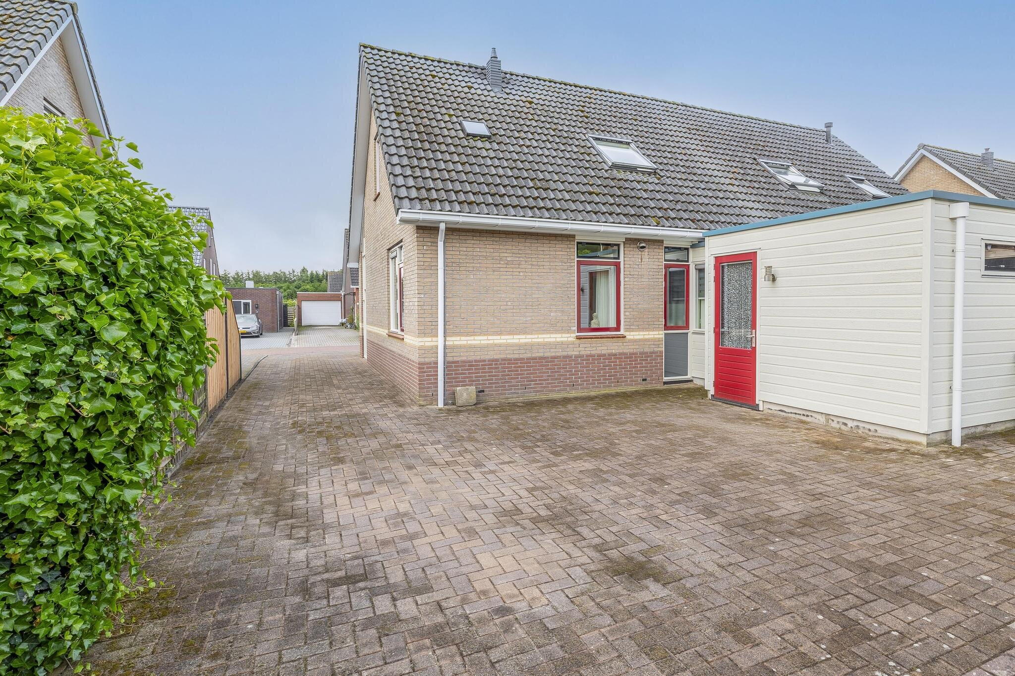 De voortuin bestaat uit een grindvlak en nette bestrating welke doorloopt naast de woning als oprit en achter de woning overgaat in een royaal terras. De op het noorden gelegen achtertuin (geen overbodige luxe in de hete zomer) is onderhoudsvriendelijk aangelegd. De schuttingen rondom bieden de nodige privacy. Tussen de grasstroken achterin staat een mooi groot houten tuinhuis in Zwitserse stijl met schuurgedeelte (ca 14 m²) en een net zo ruime overkapping aan de voorzijde. Hier kun je gezellig, droog en in de schaduw zitten.